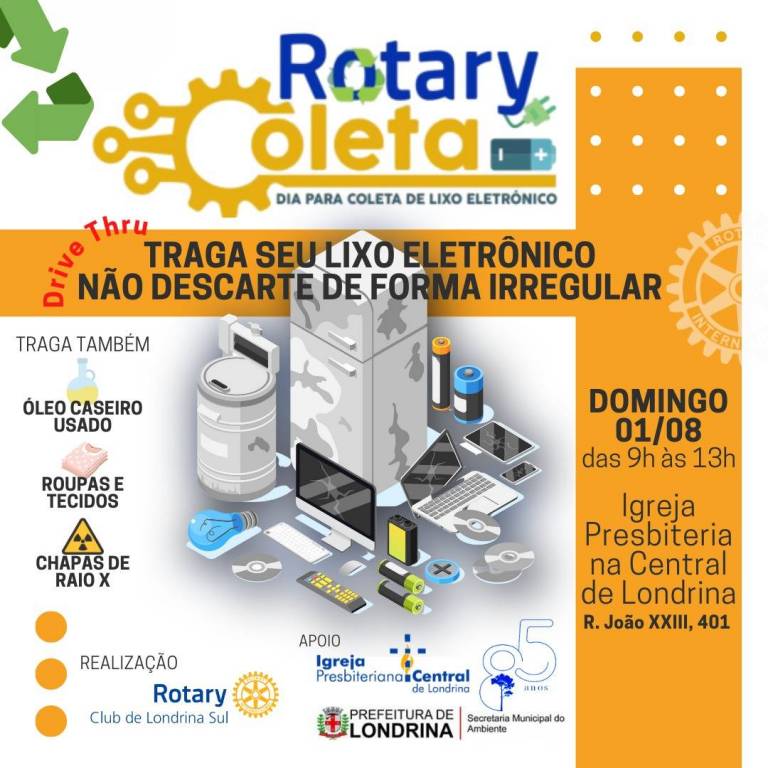 Com o apoio da Prefeitura de Londrina, através da Secretaria Municipal de Ambiente (SEMA), e desta vez com a parceria da da Igreja Presbiteriana Central de Londrina, o projeto Rotary Coleta será realizado neste domingo (1º), das 9h às 13h, pelo Rotary Club de Londrina Sul.
