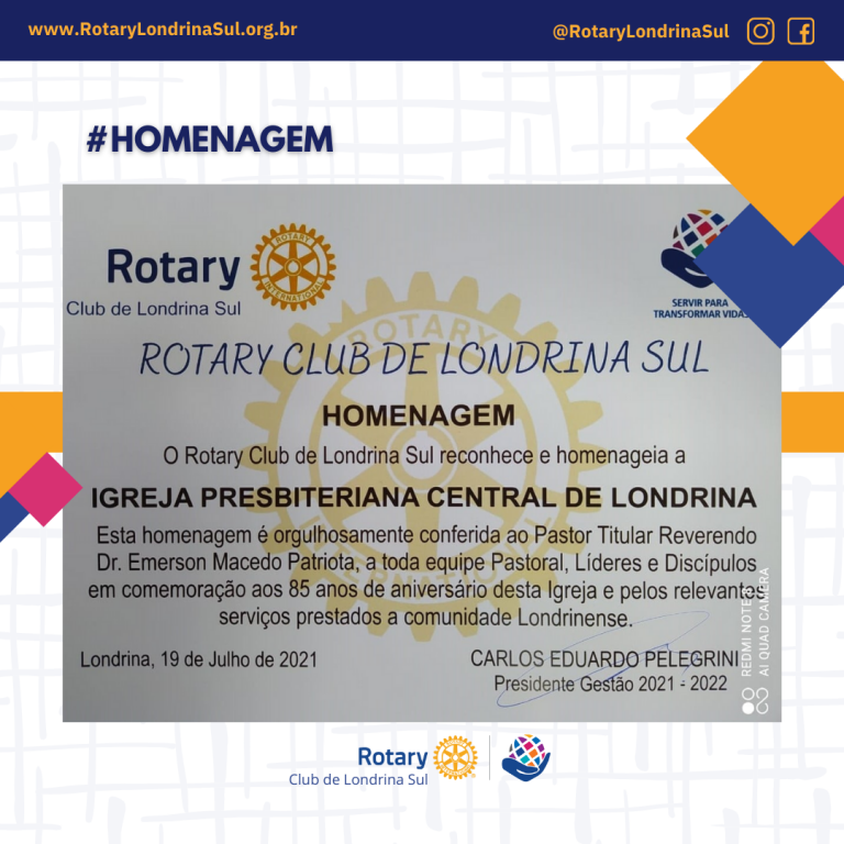 Representantes do Rotary Club Londrina Sul estiveram presentes na Igreja Presbiteriana Central de Londrina para entrega do certificado em homenagem pelo aniversário de 85 anos de história desta Igreja e pelos relevantes serviços prestados à comunidade Londrinense.