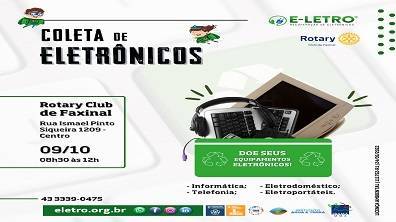 O Rotary Club de Faxinal realizará no dia 09/10/2021 (sábado) uma coleta de aparelhos eletrônicos e de eletrodomésticos quebrados ou que estejam em desuso.