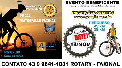 Faxinal é conhecida como a CAPITAL NACIONAL DAS CACHOEIRAS. Neste cenário paradisíaco será feito 1º PEDAL WATERFALL FAXINAL. As 07h00 abre o Café da Manhã para os participantes que estarão portando pulseirinhas. As pulseiras serão entregues no local. As 08h00 faremos a largada por trilhas bem sinalizadas tendo a possibilidade de escolha entre a trilha curta e a longa. Medalha para os primeiros 100 inscritos. Troféus para os 3 primeiros colocados do maior percurso. Troféu para a maior equipe presente.