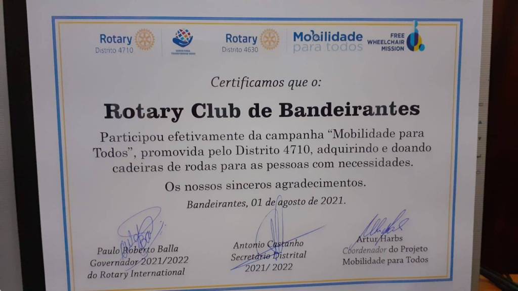 Na última terça-feira, 03 de agosto, o Governador 2021/2022, Paulo Roberto Balla e sua esposa, Companheira Aureliana Balla, participaram da reunião festiva realizada pelo Rotary Club de Bandeirantes, com a finalidade de entregar cadeiras de rodas do projeto "Mobilidade para Todos", uma parceria do Rotary com a Free Whellchair Mission. Essa produtiva e abençoada parceria das duas instituições entrega cadeiras de rodas a pessoas e instituições já há 03 anos no Distrito 4710 e tem beneficiado milhares de pessoas que necessitam resgatar sua mobilidade.