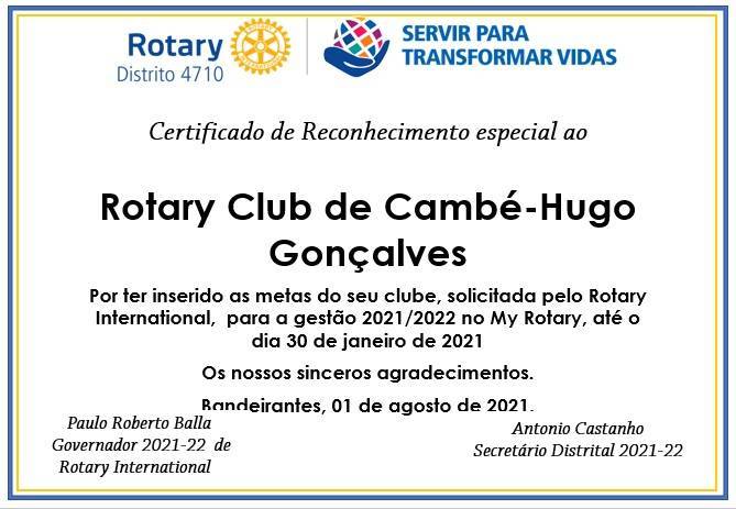 Em reunião festiva realizada no dia 09 de agosto, na Casa da Amizade de Cambé, o Governador 21/22 do Distrito 4710, Paulo Roberto Balla, fez a entrega de certificados ao Rotary Club de Cambé-Hugo Gonçalves e companheiros, pelo cumprimento de metas distritais, como atualização de dados na plataforma do My Rotary, a indicação de companheiros e colocação de metas. Na ocasião, o Governador ressaltou a importância dessas metas, tanto que o RIBO – Rotary International Brazilian Office, certifica, através do programa “Suas Metas, Nosso Sucesso”, os clubes que incluem mais de 20 metas na plataforma, como foi o caso do clube de Cambé. O presidente 21/22 do RC de Cambé-Hugo Gonçalves, Companheiro Valdinei Timóteo Rocha, disse que o clube e seus companheiros tem plena consciência da importância do cumprimento dessas metas e que incentiva a todos os demais presidentes a fazerem o mesmo.