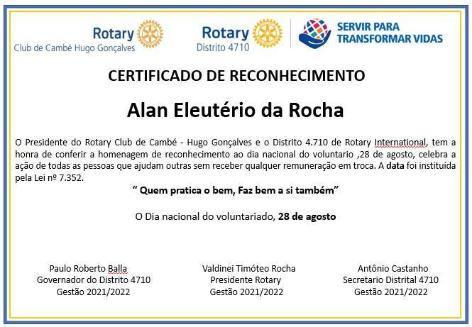 Na ocasião, o Governador e diversas autoridades rotárias presentes, também prestaram homenagens a vários voluntários que doaram seu tempo e esforços em diversas ações filantrópicas e beneficentes na cidade de Cambé. A homenagem marcou o Dia Nacional do Voluntariado, instituído pela Lei nº 7.352 e comemorado anualmente no dia 28 de agosto. Os voluntários homenageados na ocasião foram: Carlos Fernandes da Veiga, Elza Aparecida Panham Sabaini, Rogelson Alves do Nascimento, Carlos Roberto Bento, Marines Domingos Cardoso de Jesus, Sandra Marcia da Silva Martins, Anézia Roberto Carlos, Daniele Cristina Cardoso, Tiago Rodrigues Casimiro, Alan Eleutério da Rocha, Maria Inês Madalosso Belanson, Edno Gonçalves da Cruz, Gleice Covino do Santos, Alzira Elizabeth de Oliveira, Wilson Silva, Laércio Neres Monteiro e Gisele Alecia Rodrigues.