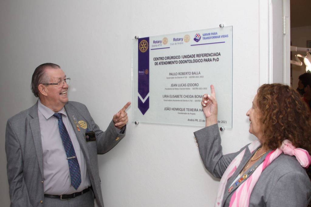 Em seguida, o Governador Paulo, juntamente com a comitiva de rotarianos, seguiram para a Sociedade Hospitalar Beneficente de Andirá, onde foram recepcionados por autoridades municipais e sanitárias, para a inauguração de uma “Unidade Referenciada de Atendimento Odontológico para Pessoas com Deficiência”, fruto de um projeto de subsídio distrital. Os equipamentos e toda a instalação do referido centro, receberam recursos da ordem de US$33,000.00 (trinta e três mil dólares), através da Fundação Rotária, de um clube parceiro da Argentina e de doações individuais de companheiros de Andirá e Cornélio Procópio. A instalação foi feita no Centro Cirúrgico da Santa Casa e está à disposição das pessoas que necessitam de cuidados especiais para tratamento odontológico. Na solenidade foram entregues certificados de reconhecimento a todos os envolvidos na elaboração e realização do projeto.