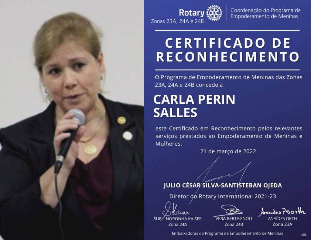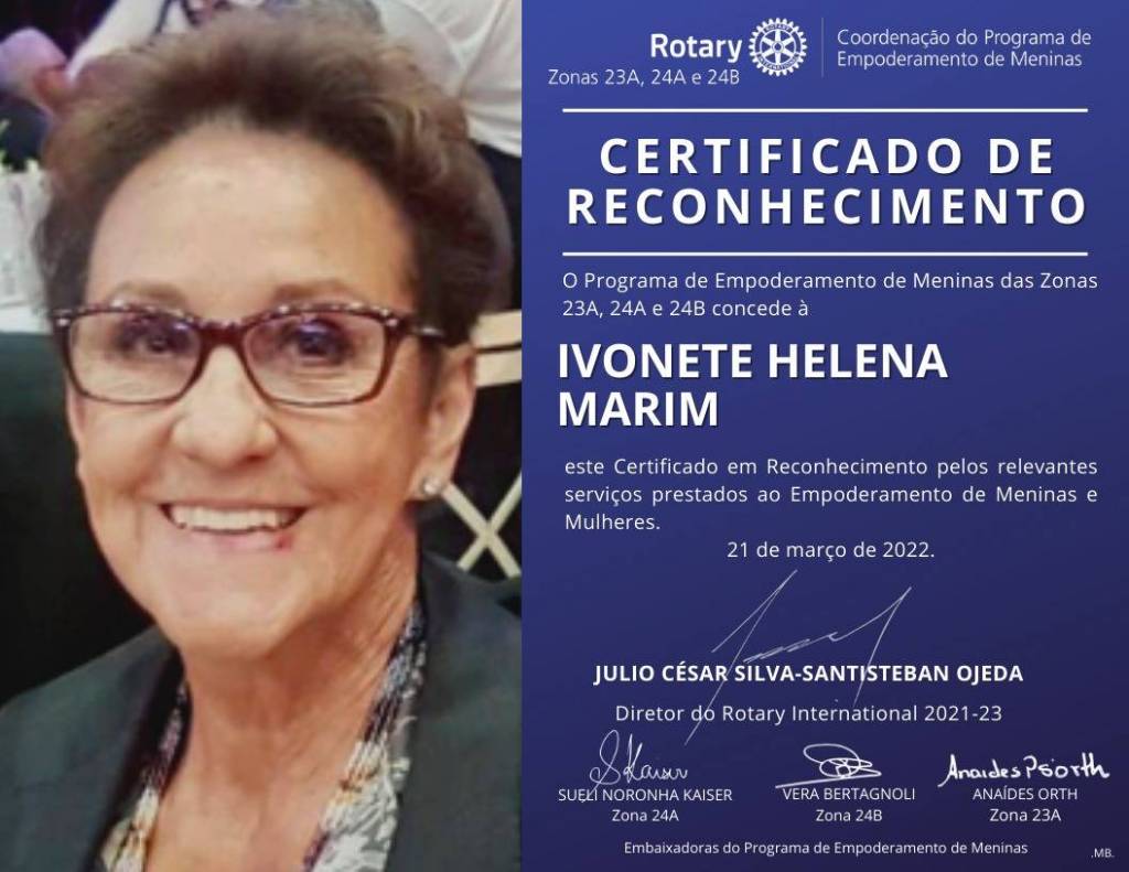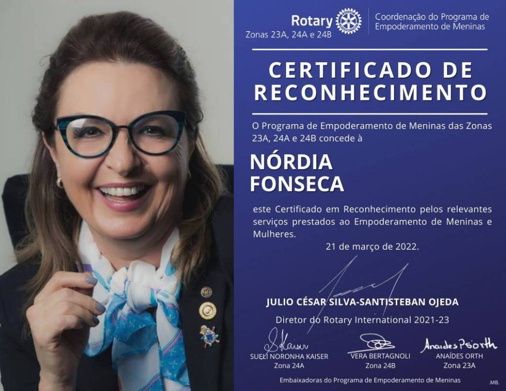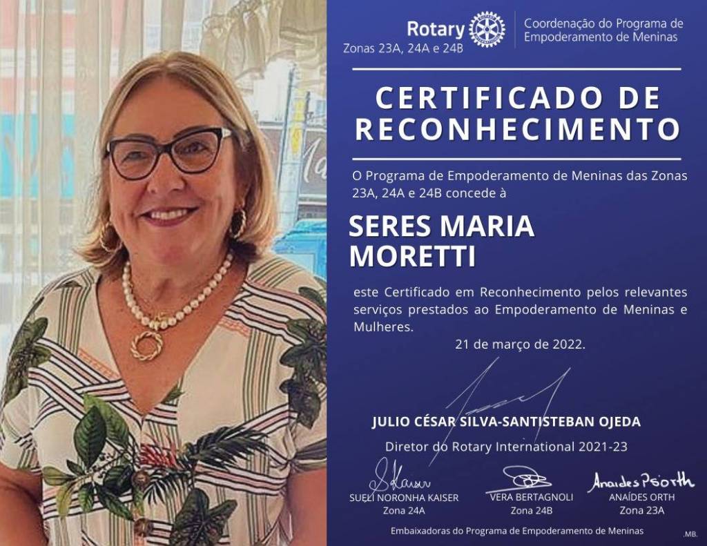 O certificado é assinado pelos dirigentes do projeto Empoderamento de Meninas no Brasil: Julio César Silva-Santisteban Ojeda – Diretor do Rotary International 2021/2023, Sueli Noronha Kaiser – Embaixadora do Programa de Empoderamento de Meninas - Zona 24A, Vera Bertagnoli – Embaixadora do Programa de Empoderamento de Meninas - Zona 24B e Anaides Orth – Embaixadora do Programa de Empoderamento de Meninas - Zona 23ª.