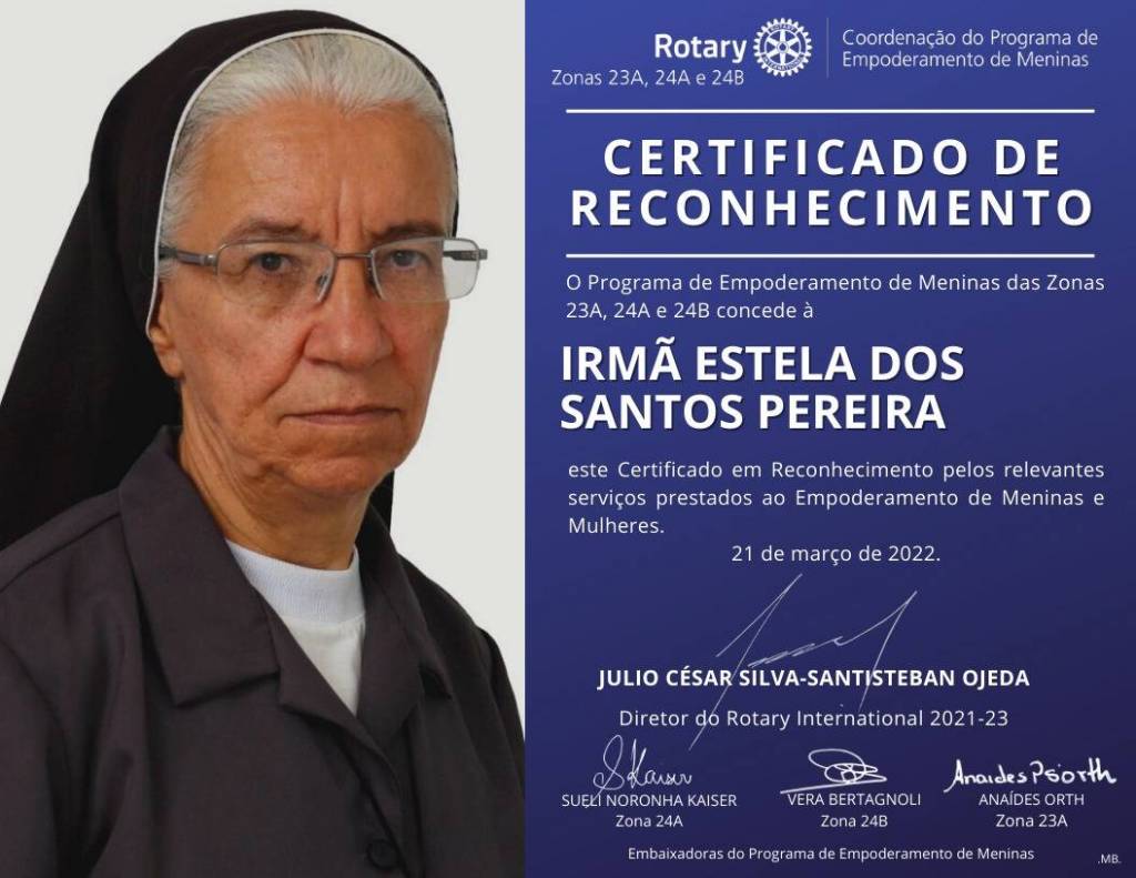 No dia 21 de março passado, durante um evento online realizado pela Coordenação do Programa de Empoderamento de Meninas do Rotary International para as Zonas 23A, 24A e 24B, aconteceu um momento de homenagens muito importante para todos aqueles companheiros e companheiras que atuam na realização de grandioso e imprescindível projeto “Empoderamento de Meninas”. Na ocasião, a Coordenação homenageou com um certificado especial, mulheres rotarianas e não rotarianas que tem se destacado em ações ligadas a esse projeto. E a única mulher não rotariana da Zona 23A a ser homenageada, foi a Irmã Estela dos Santos Pereira, que tem desenvolvido um grande trabalho com meninas menores e adolescentes na comunidade “Aparecidinho” em Santo Antônio da Platina. As demais homenageadas são todas rotarianas de outros distritos do Brasil.