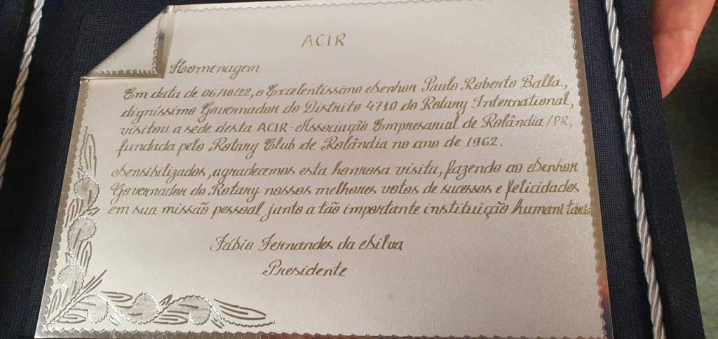 No dia 06 de outubro, o Governador 2022-23, Paulo Roberto Balla, realizou a visita oficial aos clubes de Rolândia Rotary Club de Rolândia e Rotary Club de Rolândia – Caviúna. O Governador, acompanhado de sua esposa, a Primeira Dama Aureliana Balla, foi recebido no Restaurante Bom Garfo para o almoço, pelo Presidente do Rotary Club de Rolândia, Antenor Soares Bem e por diversos companheiros de clube. Na ocasião, o governador realizou a assembleia extraordinária com o clube, como tem feito em todas as suas visitas. Além de expor importantes informações sobre o Distrito e discutir o alcance metas que todos os clubes devem buscar, o Governador elogiou o trabalho até aqui realizado e recebeu dos companheiros a certeza de que iriam dar o máximo de si para cumprir as proposições do distrito, para todas as comissões do clube.