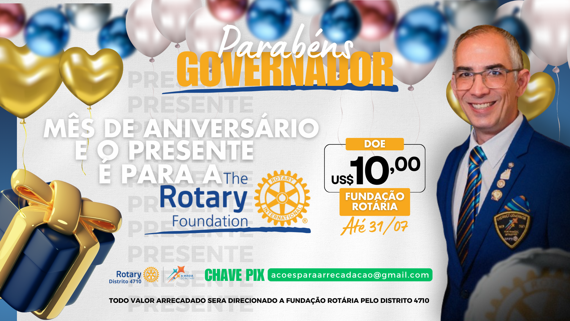 Em homenagem ao seu incansável trabalho em fortalecer nossa comunidade e promover ações de impacto positivo, convidamos todos os membros e amigos do Distrito 4710 do Rotary Internacional a transformar essa data em uma oportunidade para fazer o bem.