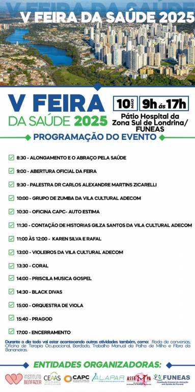 A V Feira da Saúde é organizada por diversas entidades públicas e privadas, com participação de universidades, profissionais de saúde, voluntários e comunidade. O evento oferece serviços gratuitos, oficinas de bem-estar, atividades culturais e orientações sobre prevenção de doenças e promoção da saúde.