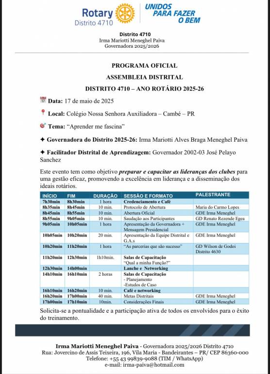 Em um tempo em que o mundo precisa de líderes preparados, o Rotary reafirma seu compromisso com o desenvolvimento contínuo de seus membros. A Assembleia Distrital é mais que um evento técnico: é um ambiente de despertar, aprendizado e conexão, onde cada líder pode se reinventar, aprimorar suas habilidades e sair pronto para conduzir um ano rotário de grandes realizações.
