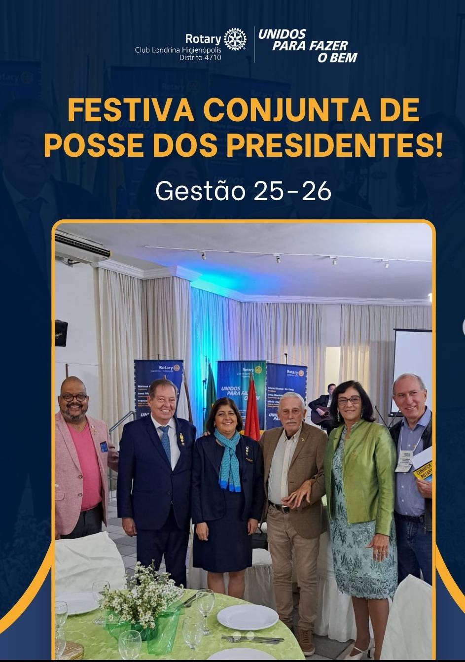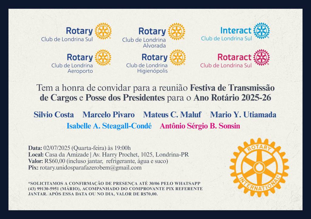 Os Rotary Clubs de Londrina Higienópolis, Londrina Sul, Londrina Aeroporto e Londrina Alvorada, integrantes do Distrito 4710 do Rotary International, realizarão em conjunto, na próxima quarta-feira, 02 de julho de 2025, às 19 horas, na Casa da Amizade (Avenida Harry Prochet, 1025 – Londrina/PR), a Reunião Festiva de Transmissão e Posse das novas diretorias para a Gestão 2025-2026.