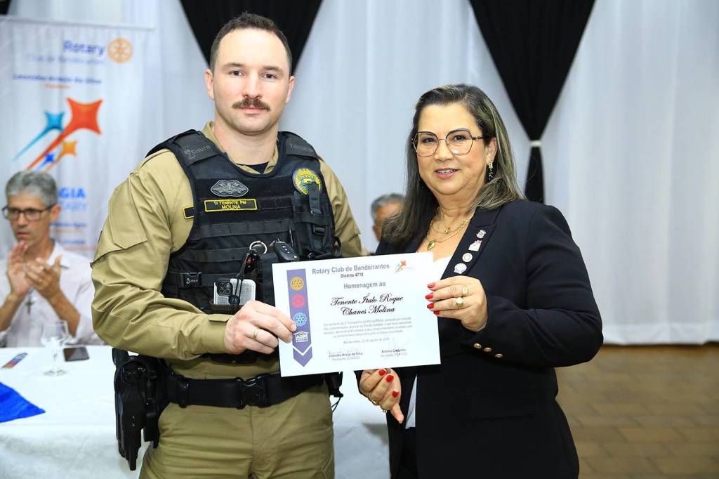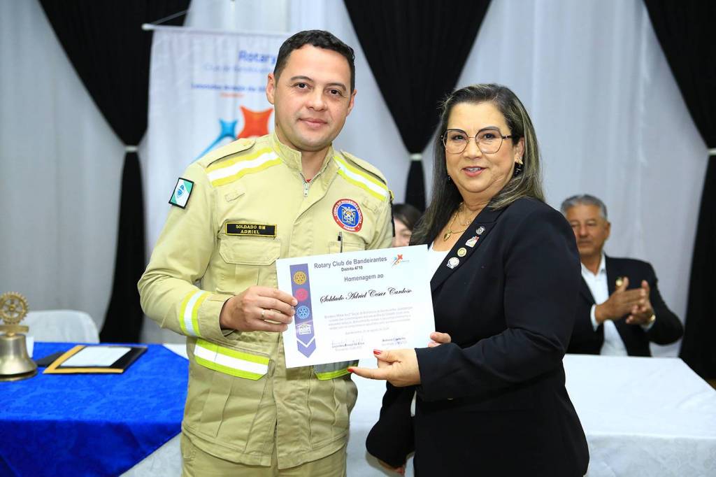 A presidente do Rotary Club de Bandeirantes, Leonides Araújo, conhecida carinhosamente como Nidinha, abriu a cerimônia destacando a importância da ocasião. “Hoje, prestamos homenagem não apenas pelo Dia do Soldado, mas também pelo trabalho e dedicação dessas instituições que têm um papel vital na nossa segurança e bem-estar” afirmou Nidinha. “É um reconhecimento pelo esforço contínuo e pelo impacto positivo que essas instituições têm em nossa cidade”, detalhou.